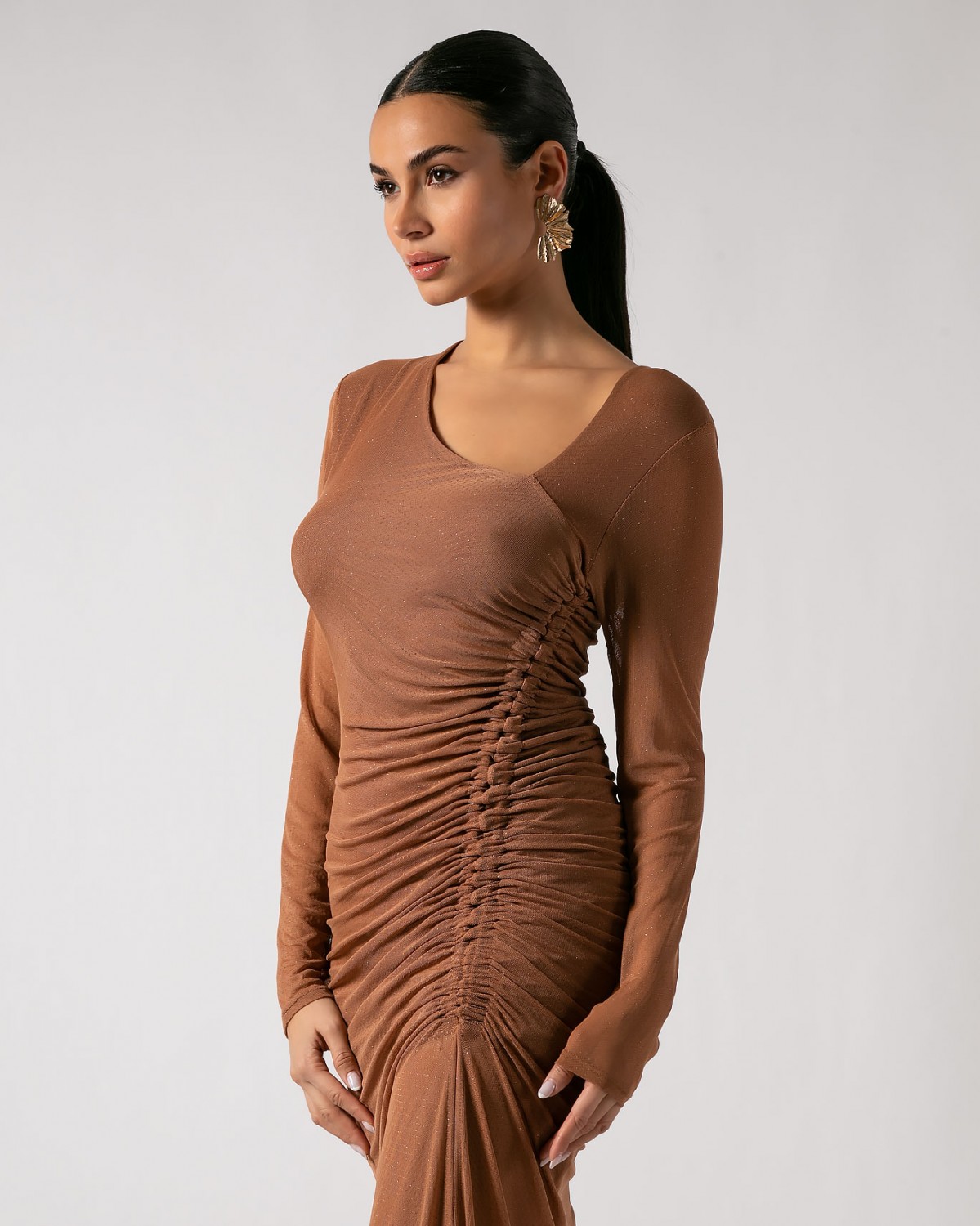 Φόρεμα maxi μακρυμάνικο σε ελαστικό τούλι με σούρα στο πλάι Πούρο