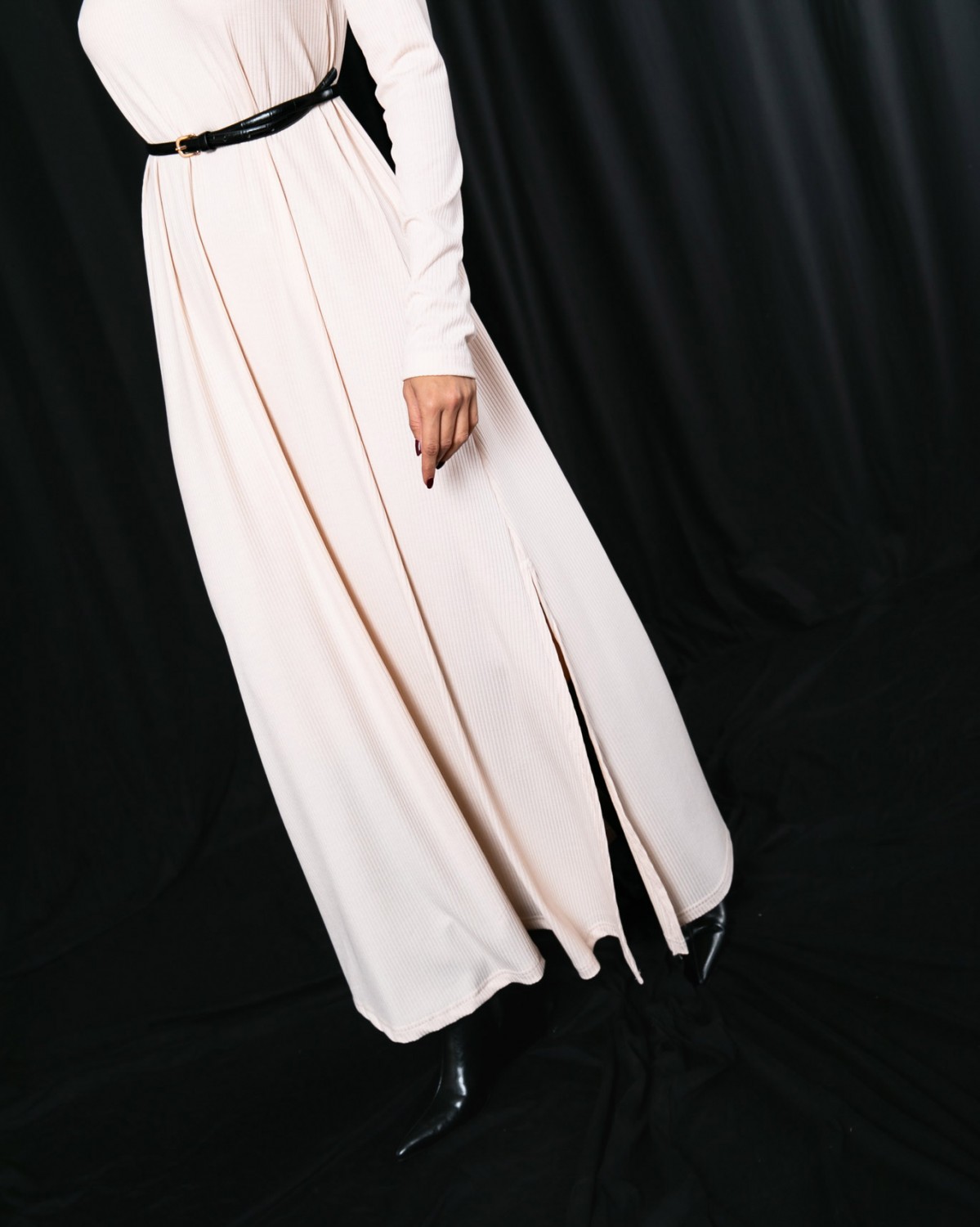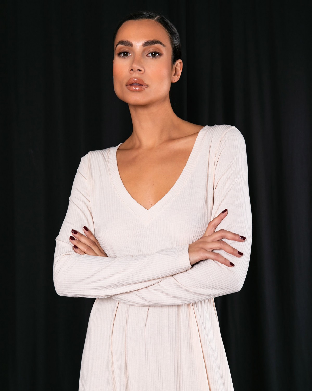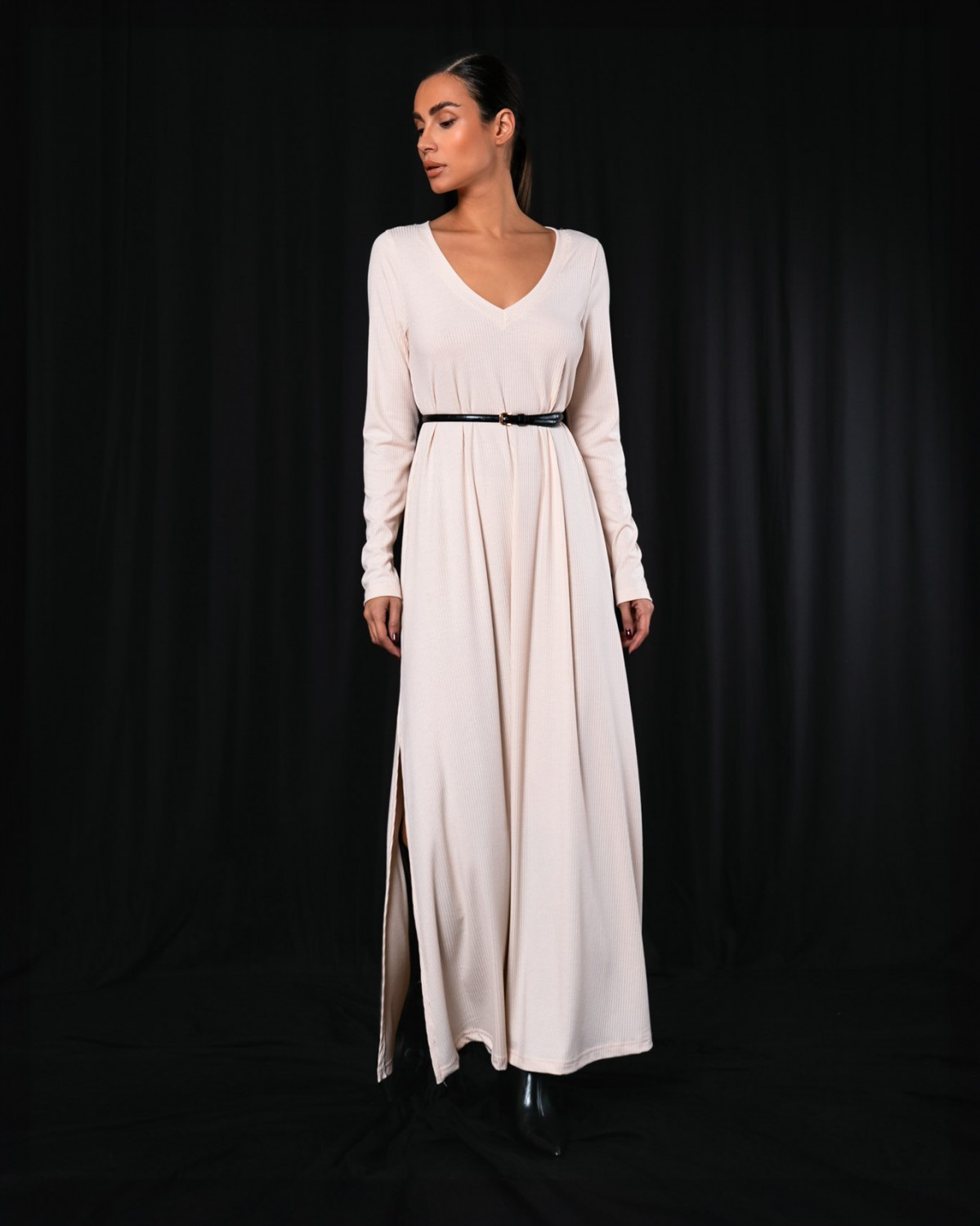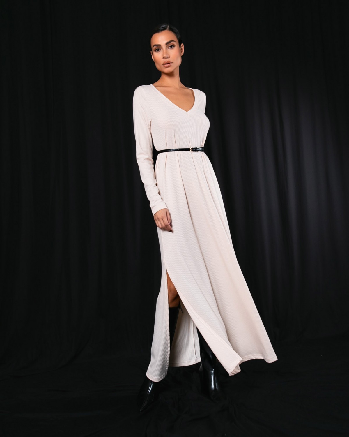 Φόρεμα maxi μακρυμάνικο σε ριπ με "V" και άνοιγμα στο πλάι Cream
