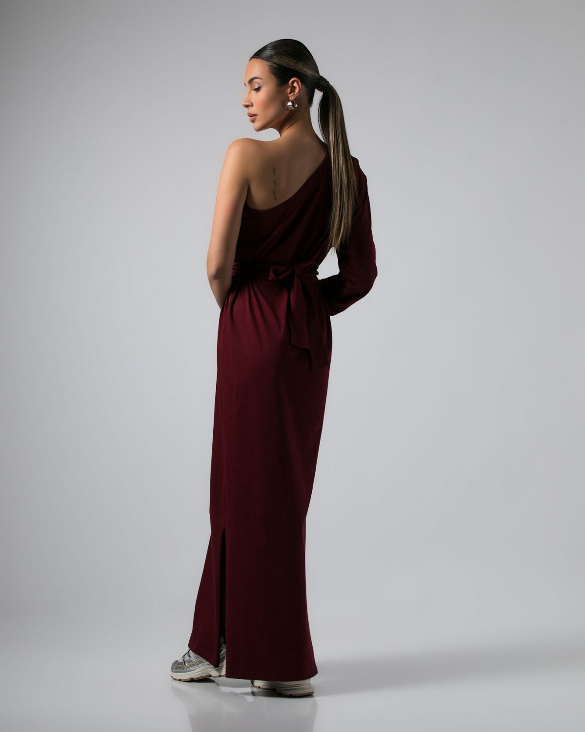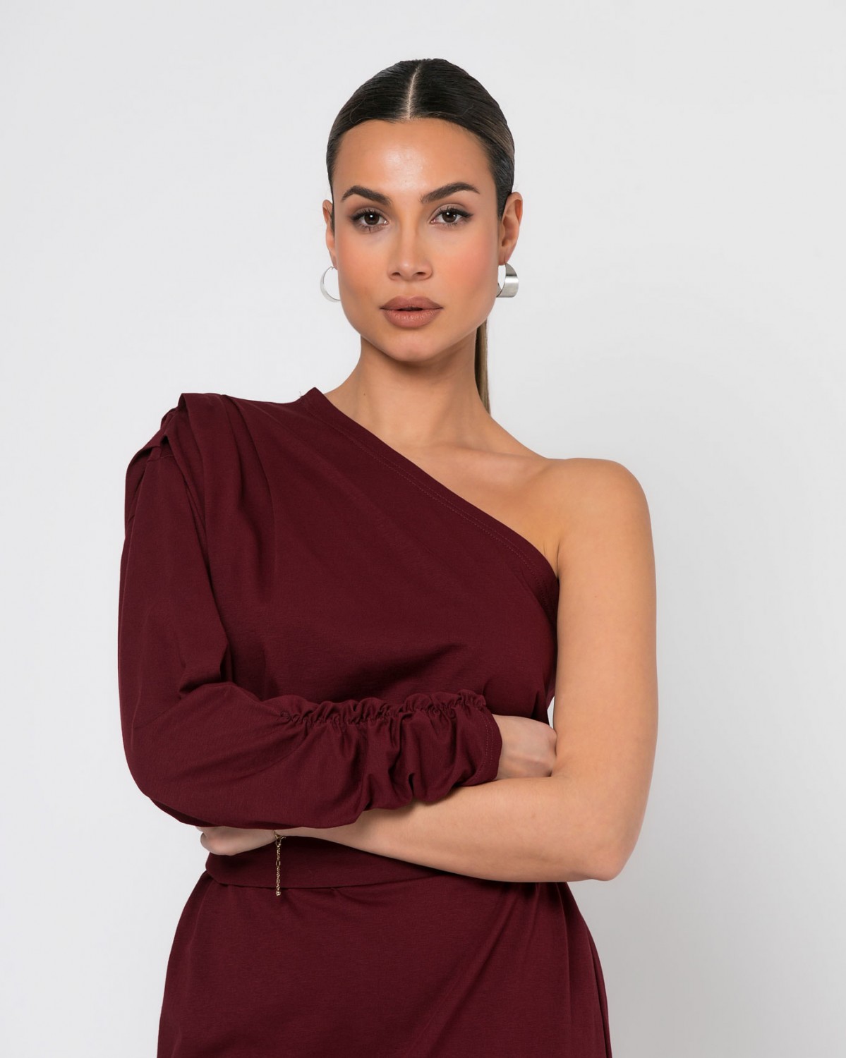 Φόρεμα maxi βαμβακερό με έναν ώμο και σούρα στο μανίκι Μπορντώ σκούρο