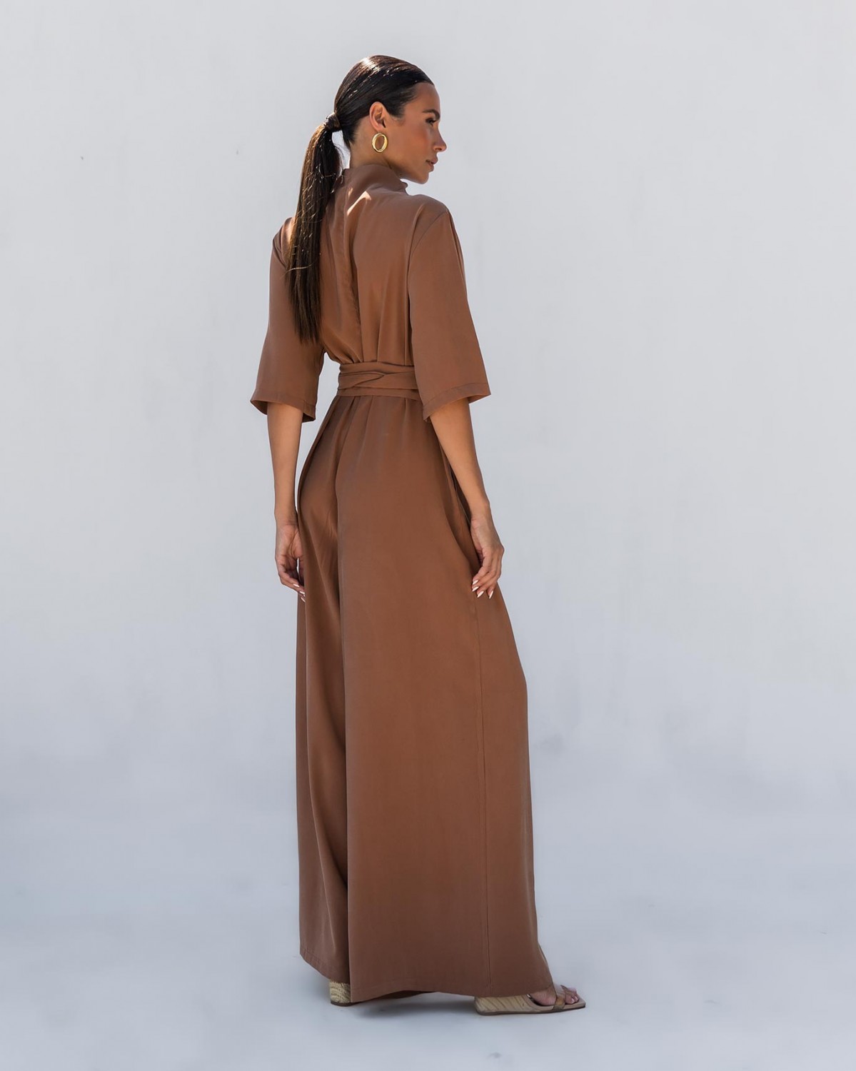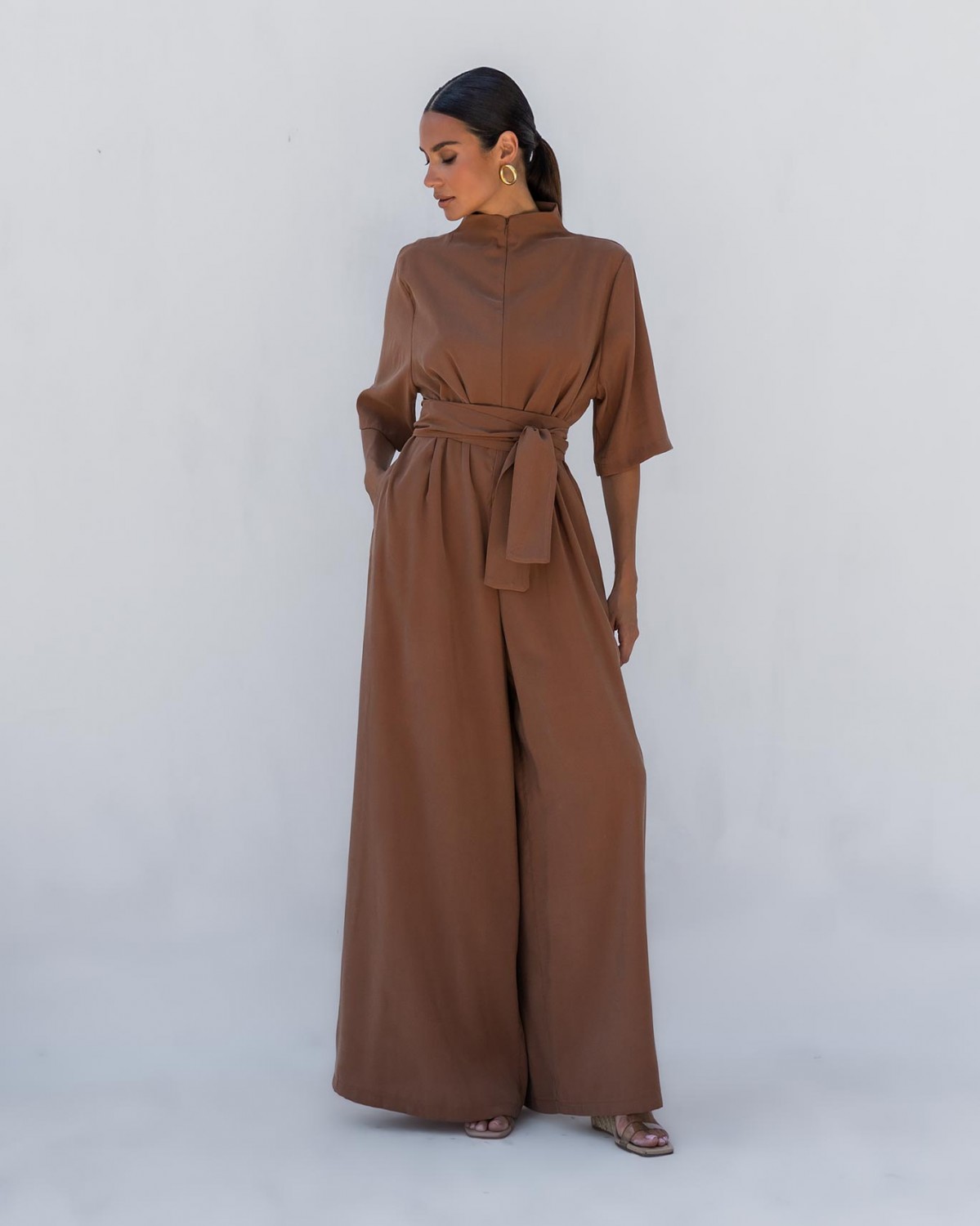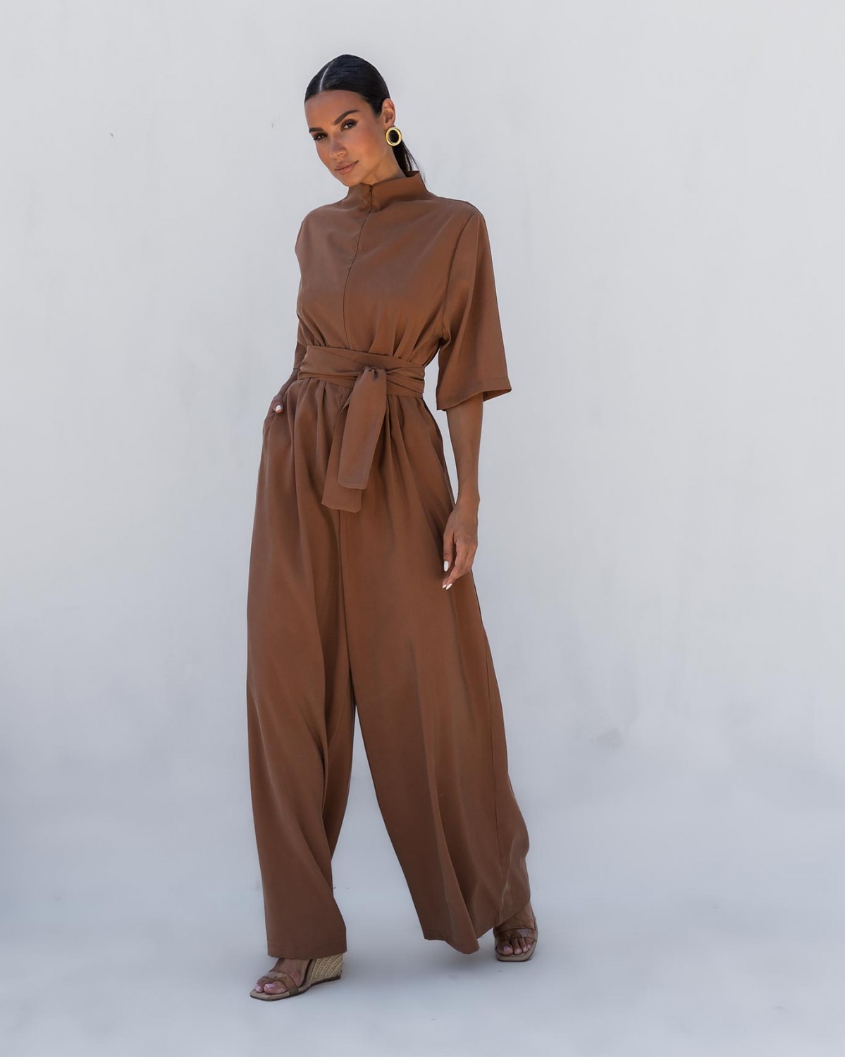 Φόρμα ολόσωμη κοντομάνικη με φερμουάρ και ζώνη Camel