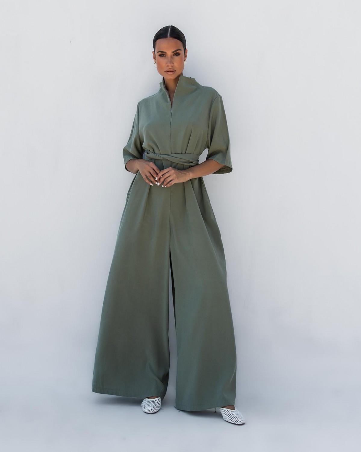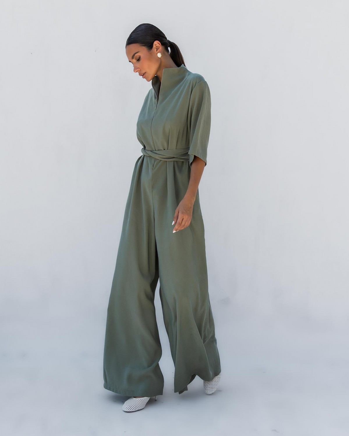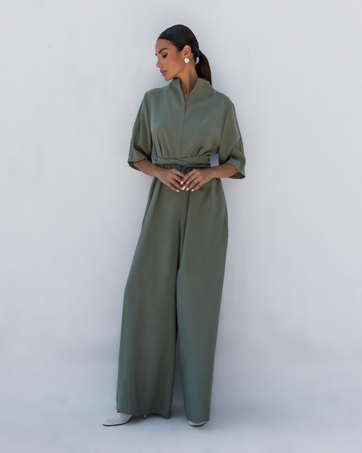 Φόρμα ολόσωμη κοντομάνικη με φερμουάρ και ζώνη Menthol