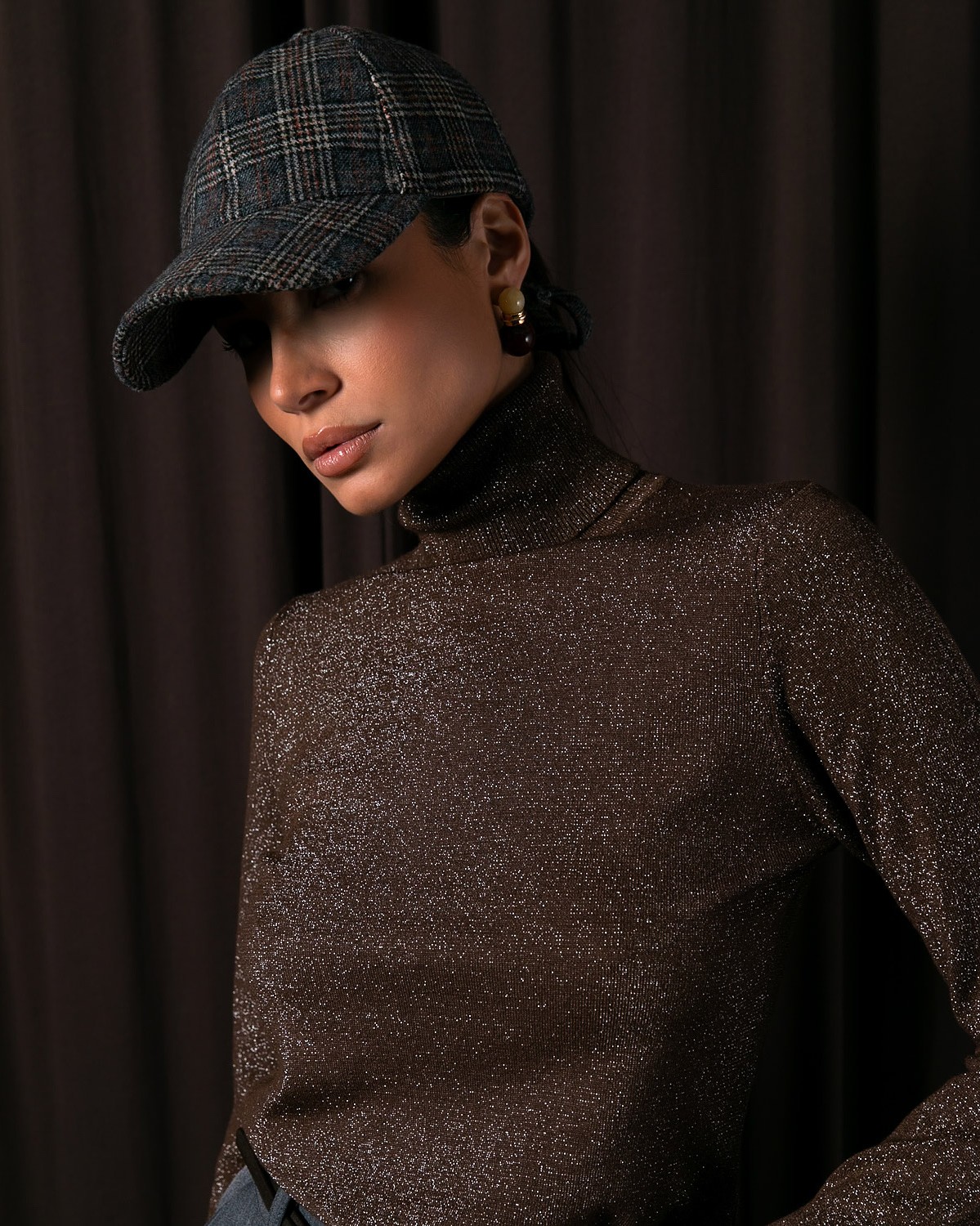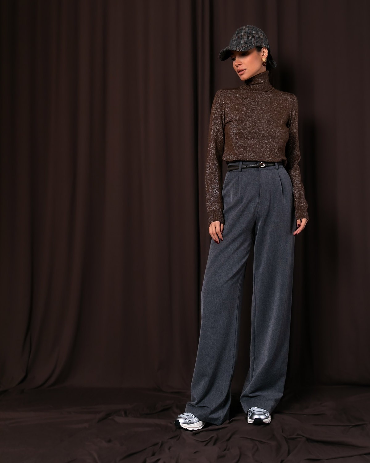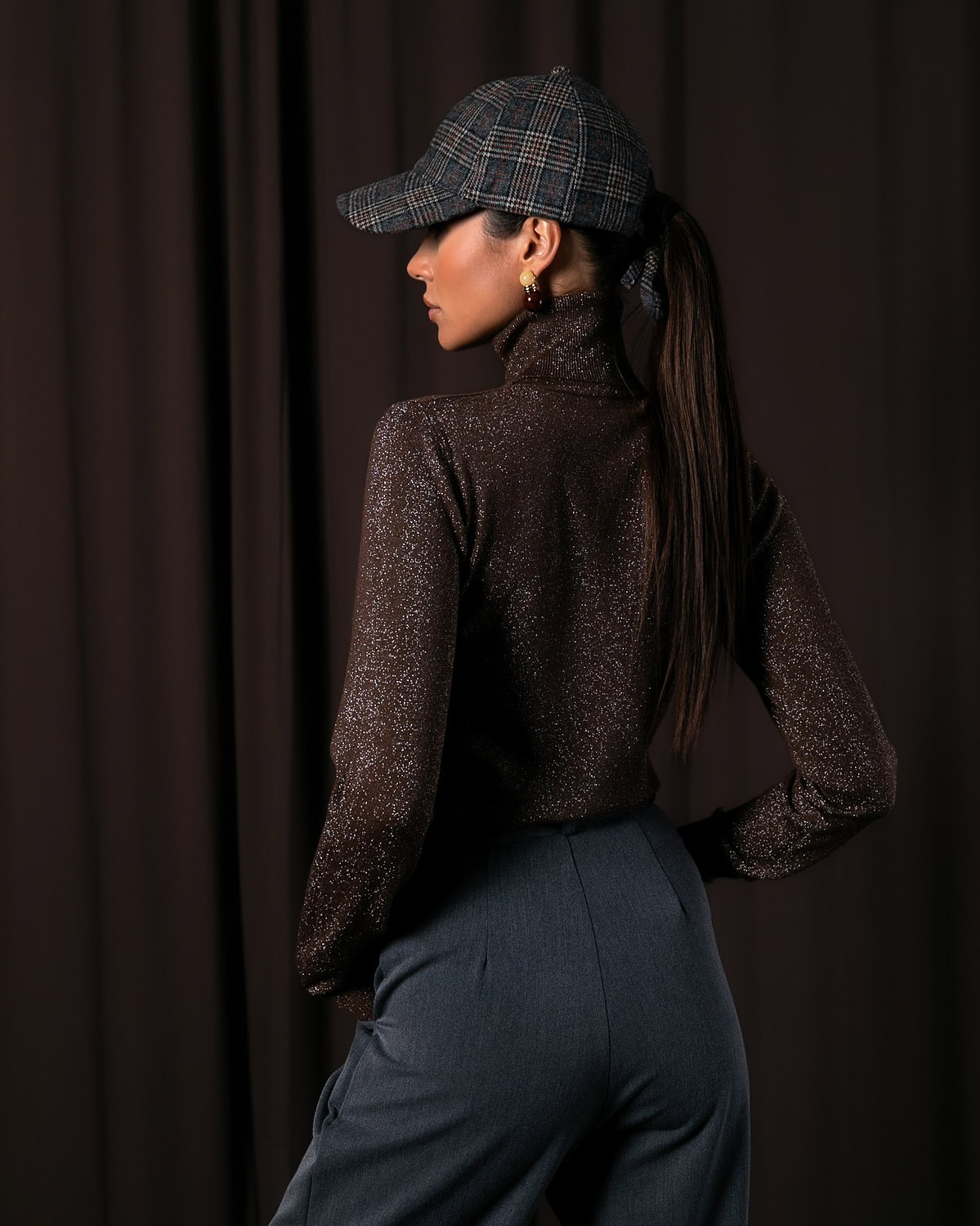 Μπλούζα μακρυμάνικη ψιλό πλεκτό ζιβάγκο με λούρεξ Brown