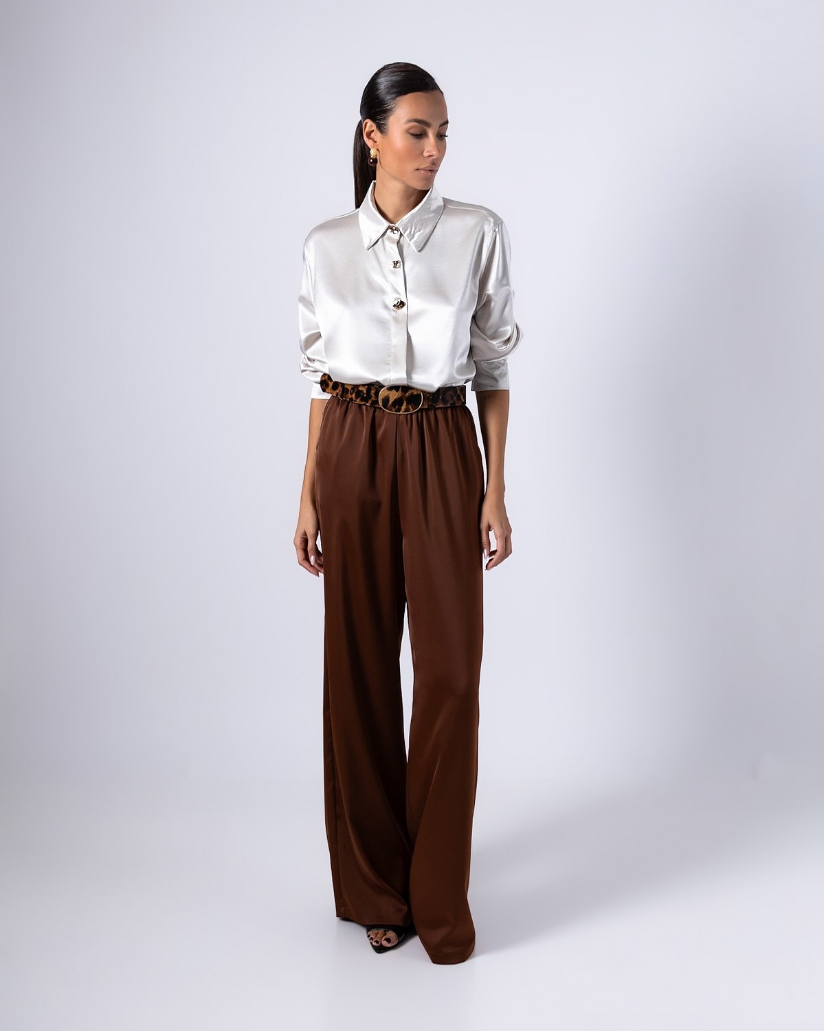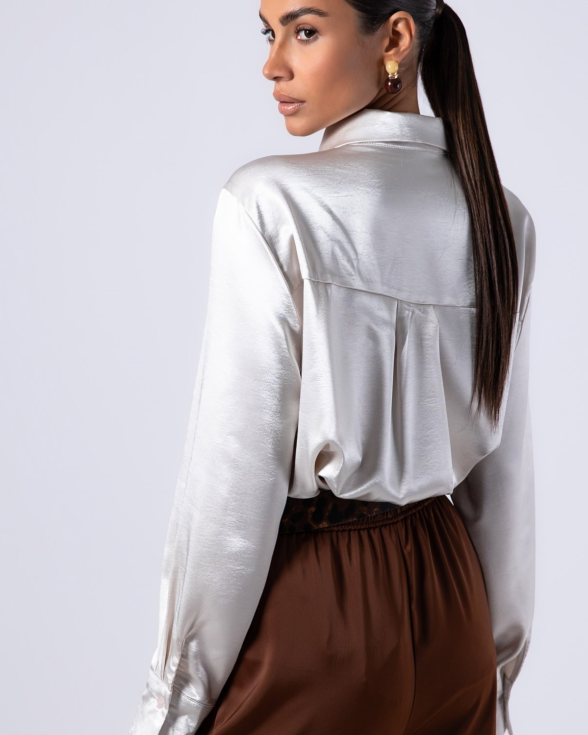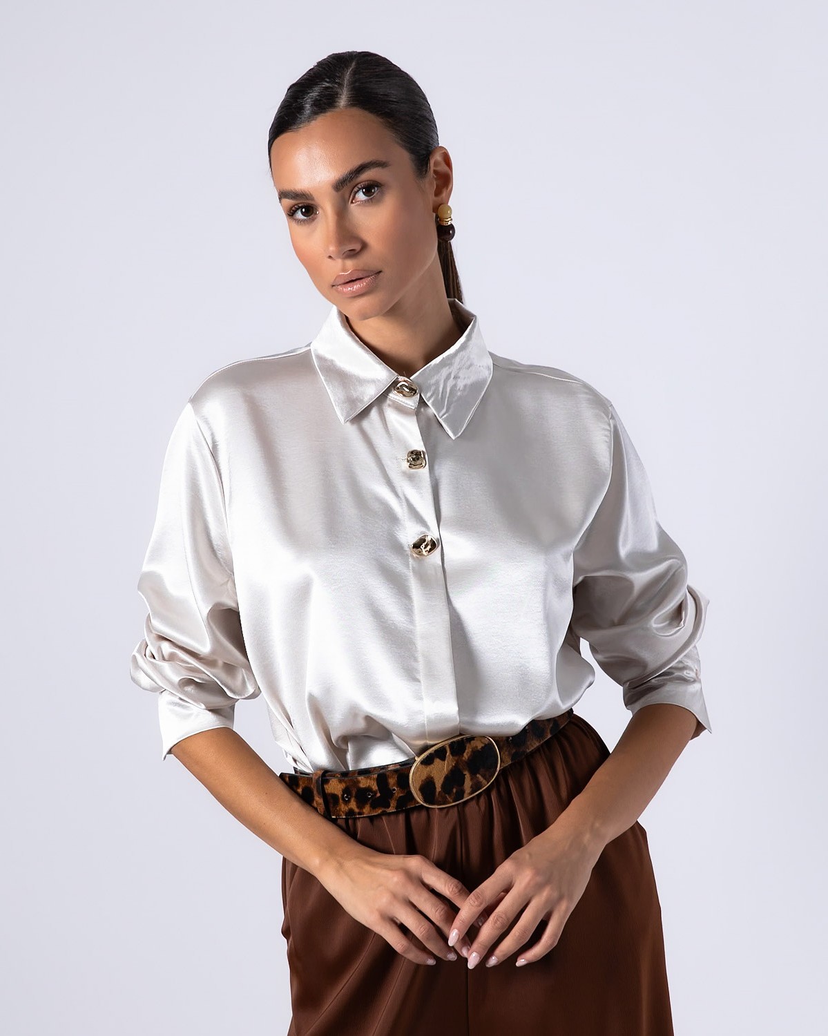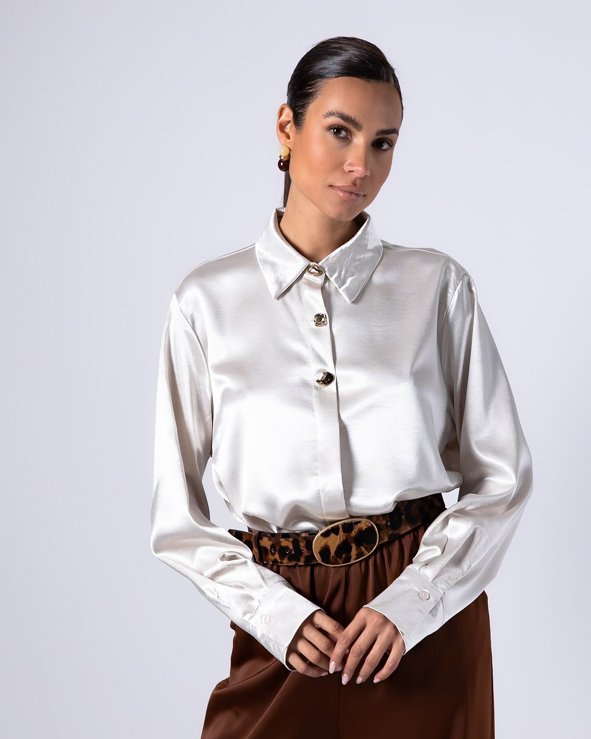 Πουκάμισο μακρυμάνικο σατέν με χρυσά κουμπιά Beige