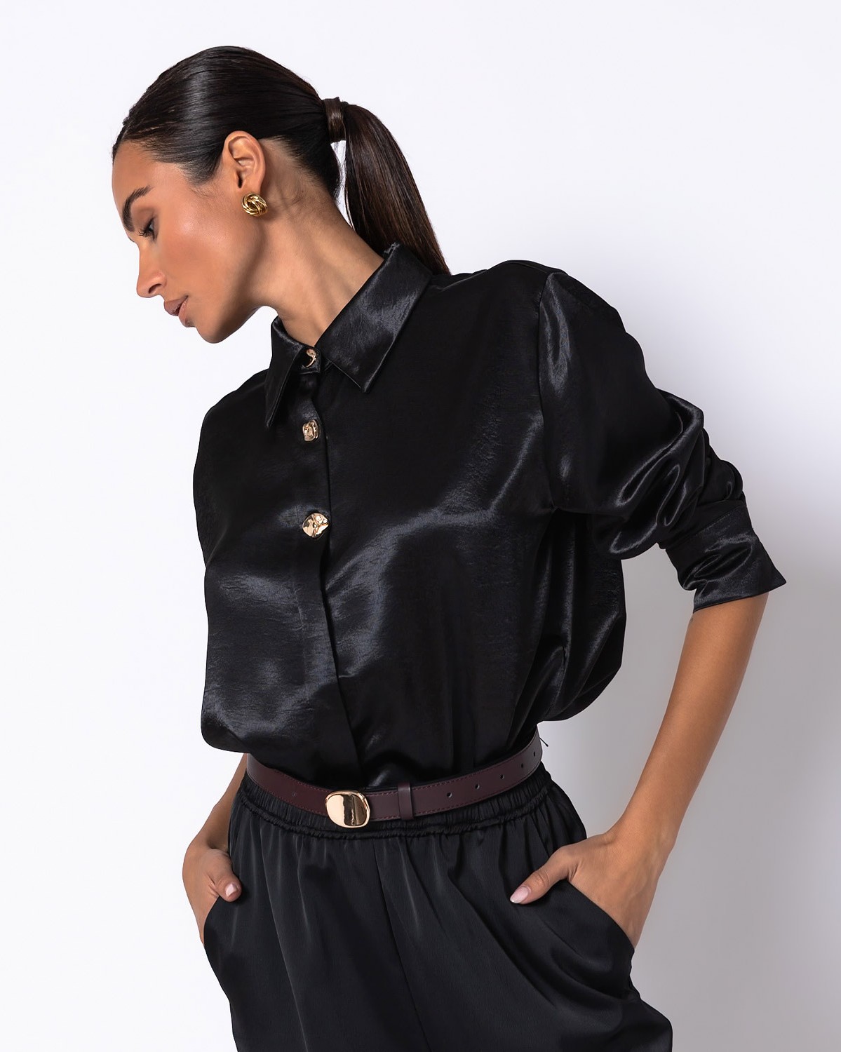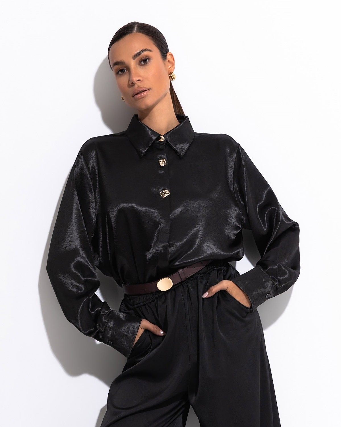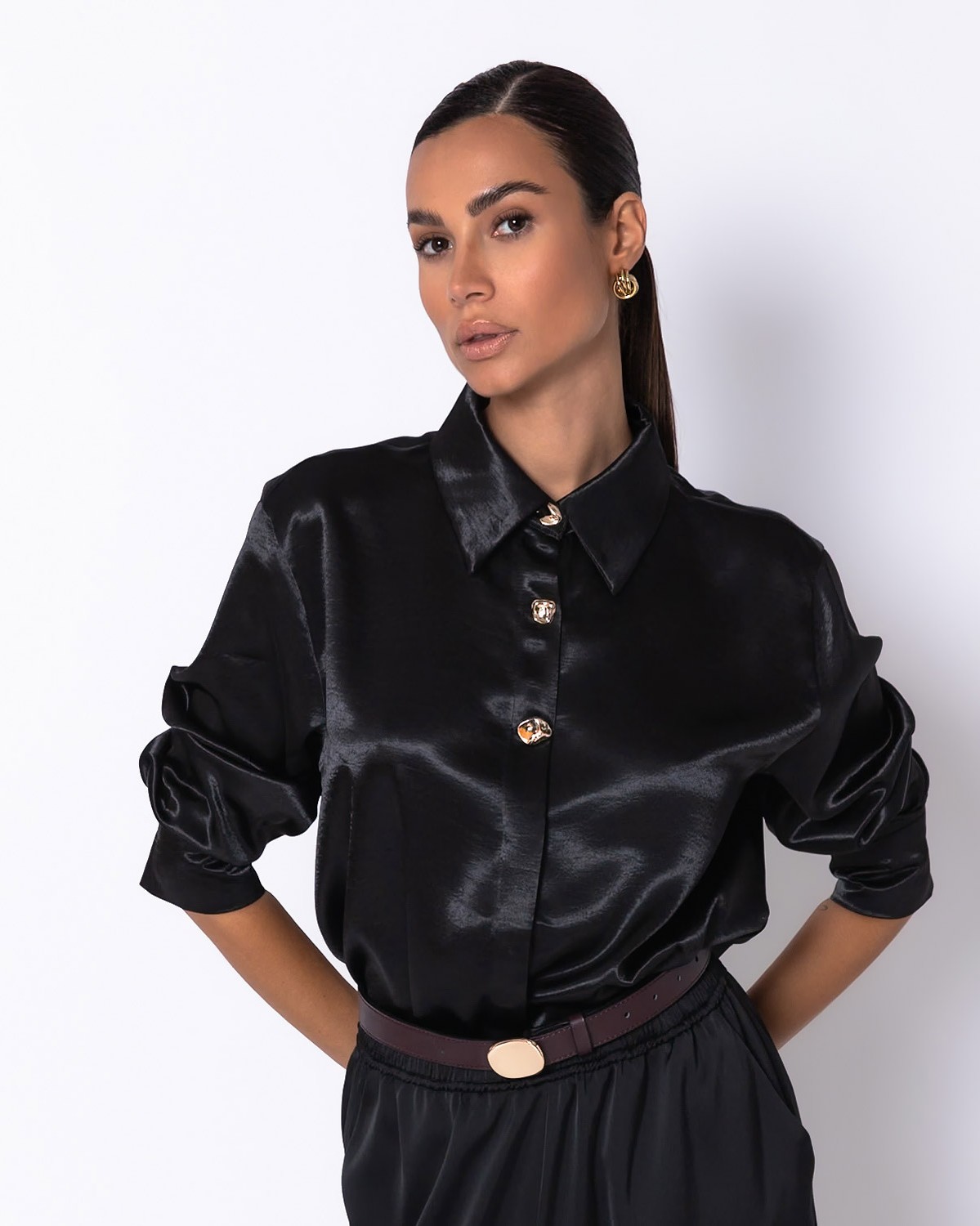 Πουκάμισο μακρυμάνικο σατέν με χρυσά κουμπιά Black