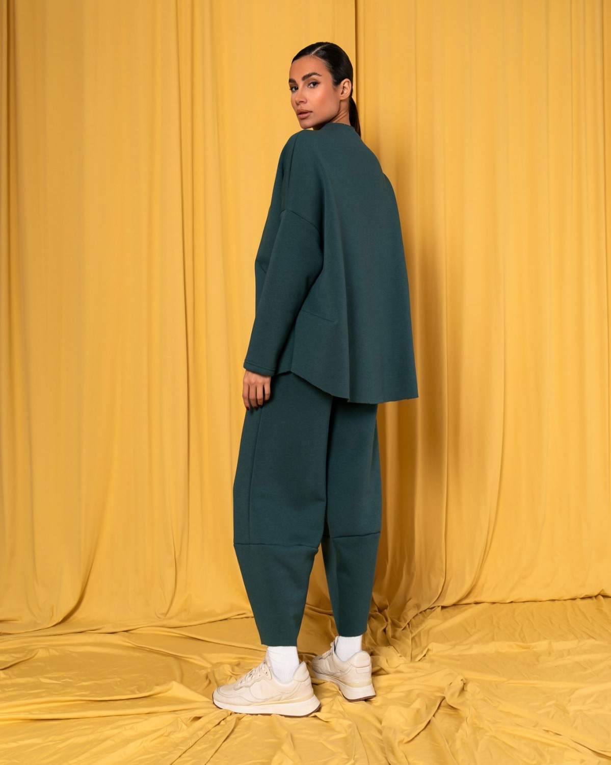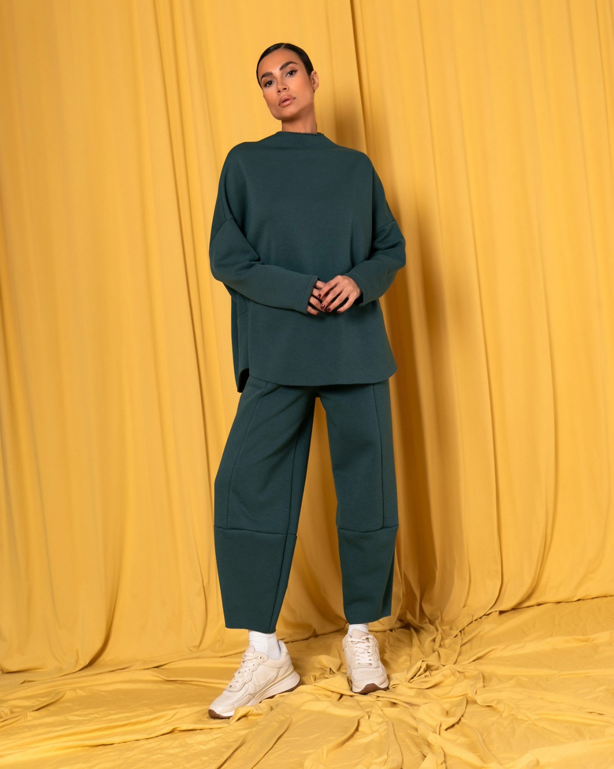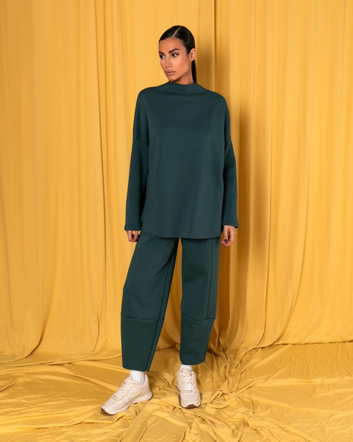 Σετ φούτερ χνούδι μακρυμάνικη μπλούζα oversized με κλειστή λαιμόκοψη - Παντελόνι carrot fit Dark green
